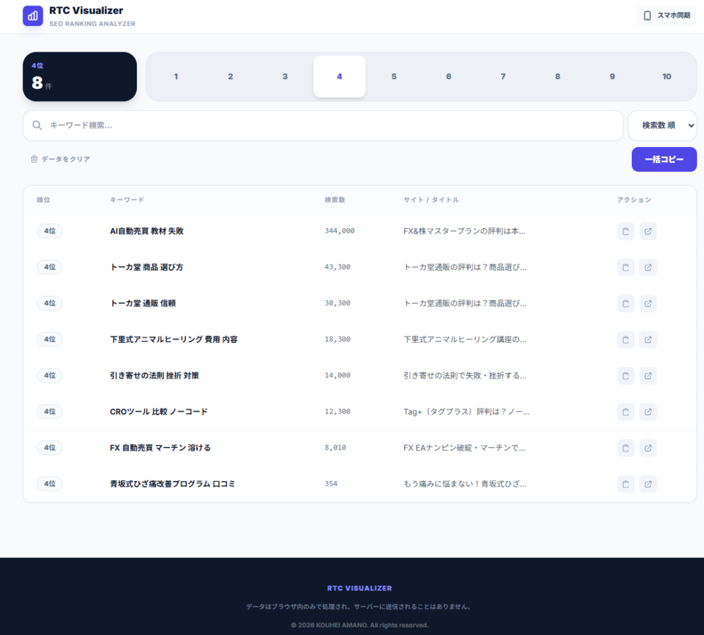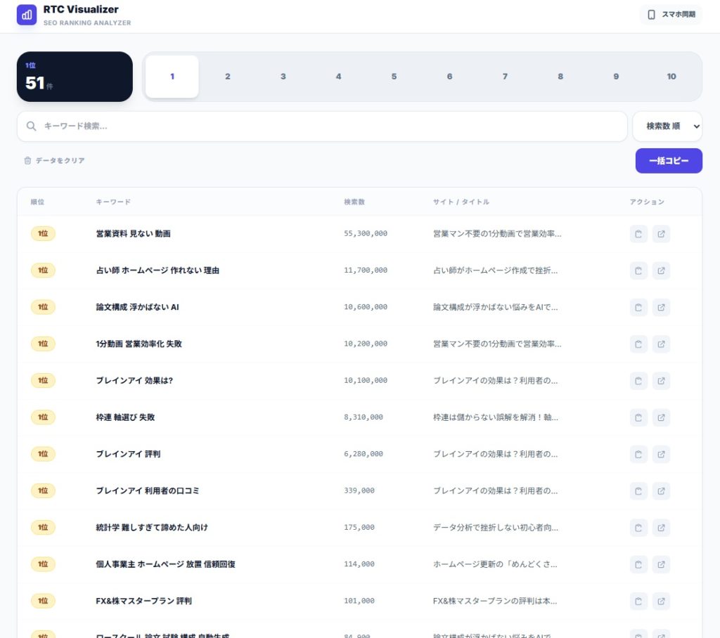 大量サイト・大量キーワードの順位確認を大幅に時短できます。