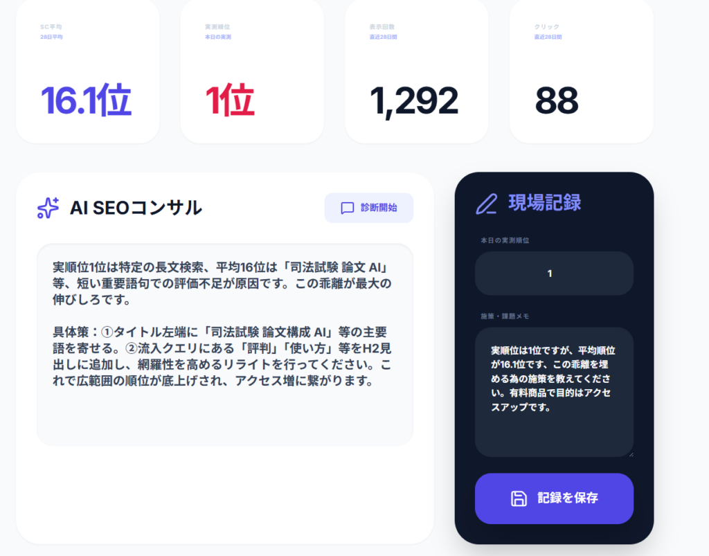 現在、実測順位では1位を獲得していますが、Search Consoleの平均順位は16.1位と大きな乖離があります。 この乖離は「一時的な評価ブレ」なのか、 それとも「評価未収束による危険シグナル」なのか、 RTCの過去28日データから判定してください。 |
